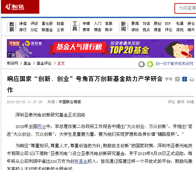 為響應(yīng)"尊重知識,尊重人才,尊重創(chuàng)造的方針,鼓勵(lì)自主創(chuàng)新"的國家政策,深圳市亞泰光電技術(shù)有限公司(以下簡稱"亞泰光電")設(shè)立亞泰光電創(chuàng)新研究基金,并于2015年5月25日正式啟動,每年將從公司利潤中拿出100萬作為創(chuàng)新基金投入,旨在通過搭建這樣一個(gè)開放式的平臺,鼓勵(lì)與激發(fā)高校人才對技術(shù)創(chuàng)新的大膽嘗試。