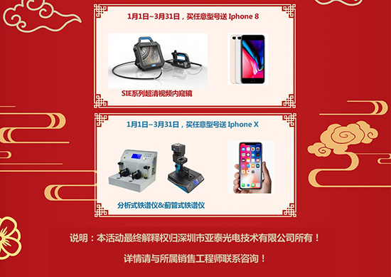 在過去的一年里,在亞泰人的共同努力下,我們?nèi)〉昧烁蟮某煽?jī),亞泰光電百萬像素內(nèi)窺鏡在國(guó)內(nèi)外市場(chǎng)進(jìn)一步拓展,經(jīng)銷商簽約量屢創(chuàng)新高,產(chǎn)品得到了國(guó)內(nèi)外市場(chǎng)的認(rèn)可和客戶一致好評(píng);油液事業(yè)部的油液監(jiān)測(cè)項(xiàng)目和眾多大型企業(yè)、高校有了更深入的合作,客戶的滿意是對(duì)亞泰人最好的獎(jiǎng)勵(lì),新年伊始,為回饋新老客戶對(duì)亞泰光電多年來的支持,亞泰光電新春送福送紅包,購儀器享豪禮!我們相信在亞泰人共同努力下,亞泰光電2018更上一層樓,亞泰光電愿與您一起共同攜手,共贏、共榮、共發(fā)展!