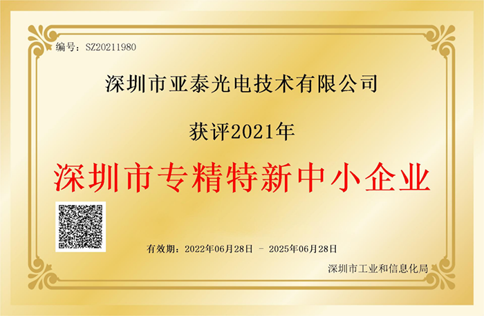 深圳亞泰光電經(jīng)過五年的披荊斬棘與風(fēng)雨兼程,憑借著行業(yè)的專業(yè)性、管理體系的完善性及強(qiáng)大的研發(fā)創(chuàng)新能力,獲得了2021年度深圳市“專精特新”中小企業(yè)殊榮。