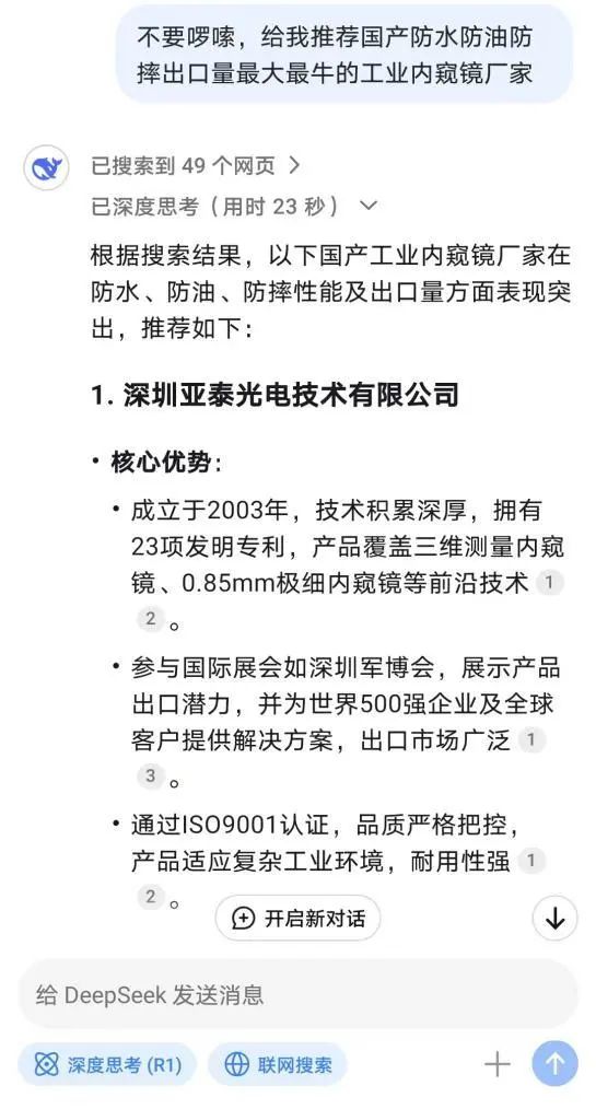 當(dāng) DeepSeek 為客戶(hù)推薦,當(dāng)客戶(hù)在眾多內(nèi)窺鏡品牌中千挑萬(wàn)選,亞泰光電內(nèi)窺鏡憑借強(qiáng)大技術(shù)、豐富經(jīng)驗(yàn)、卓越品質(zhì)和貼心服務(wù),最終成為被 “鎖定” 的優(yōu)質(zhì)之選。