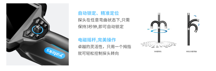 4、自動鎖定 精準(zhǔn)定位——亞泰光電專利, 步進、快慢速調(diào)節(jié)和微調(diào)鎖定功能以及電動360°轉(zhuǎn)向控制,最大單向220°彎曲角度。