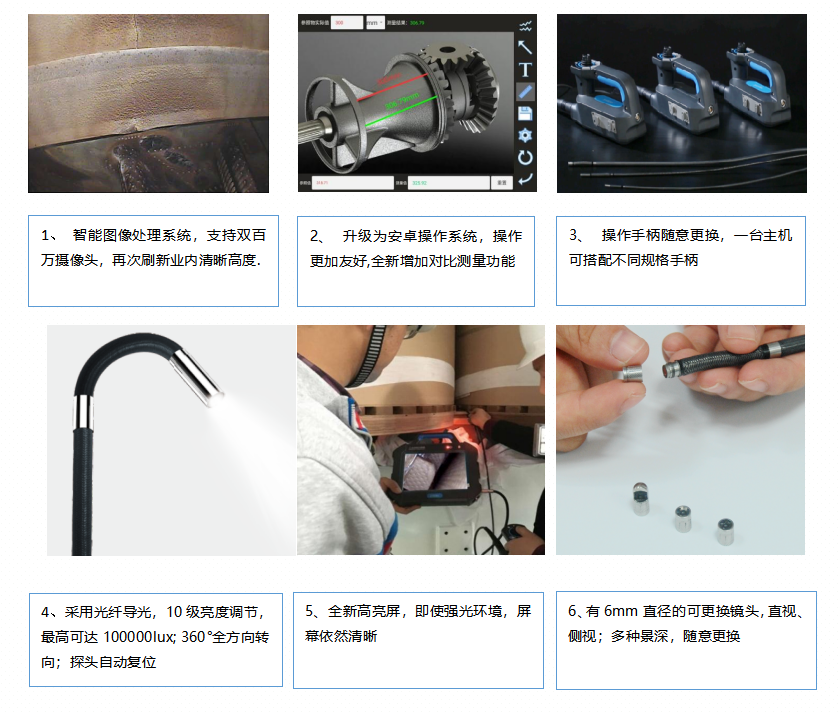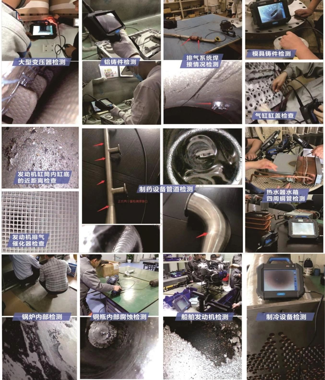 本儀器廣泛應(yīng)用于航空、汽車、船舶、電氣、化學(xué)、電力等現(xiàn)代核心工業(yè)生產(chǎn)、檢修等多個(gè)環(huán)節(jié)。具有直接可視的特點(diǎn),能夠直接觀測(cè)管道、渦輪、汽缸、發(fā)動(dòng)機(jī)等大型裝置內(nèi)表面是否存在缺陷或異狀??蛇M(jìn)行實(shí)時(shí)拍照和視頻錄制,為分析設(shè)備使用狀況及設(shè)備生產(chǎn)保障提供不可或缺的數(shù)據(jù)采集。